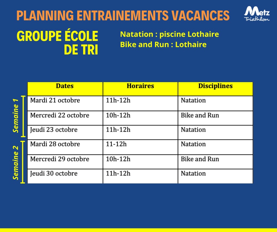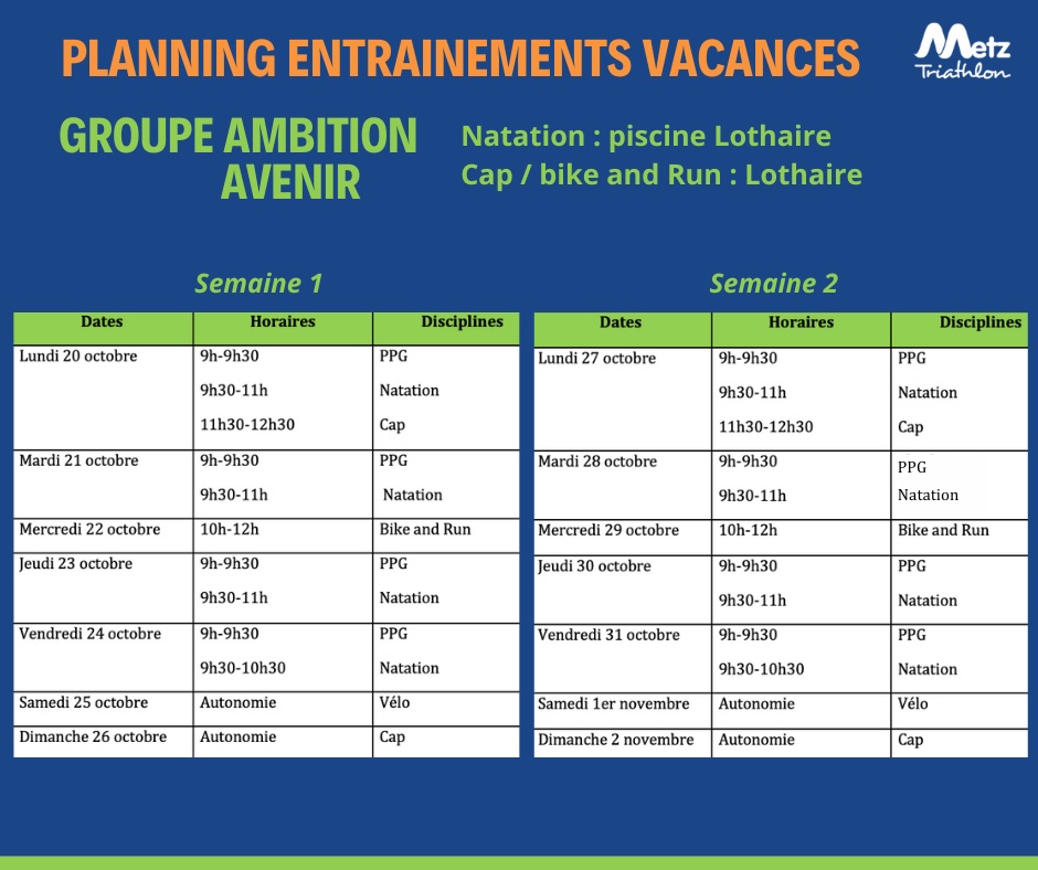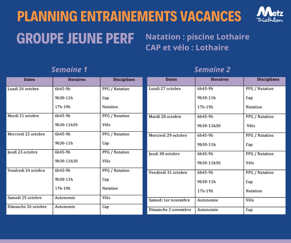 Retrouvez ci dessous les plannings d’entrainements pour les différents groupes pendant les vacances d’octobre, applicables à partir du lundi 20 octobre 2025.